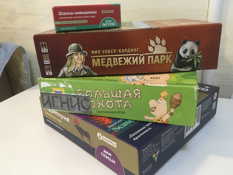 В девять вечера пока муж был занят, предложила сыграть сыну вдвоём, игру предложила выбрать самому. Учитывая, что месяца два его фаворитом была игра «Индейцы» ждала, что в 150-й раз нужно будет в неё играть. Но нет, принёс другие, можно сказать подзабытые игры, год точно не играли. Вдвоём сыграли в «Шапку-невидимку». Игра от компании «Простые правила» для 2-4 игроков, 5+, одна из первых в нашей коллекции. Игра с элементами мемори, нужно по определенным правилам найти головной убор для каждого персонажа. Ну, что сказать, сыграли с большим интересом, хорошая игра-филлер для семейных игр.
