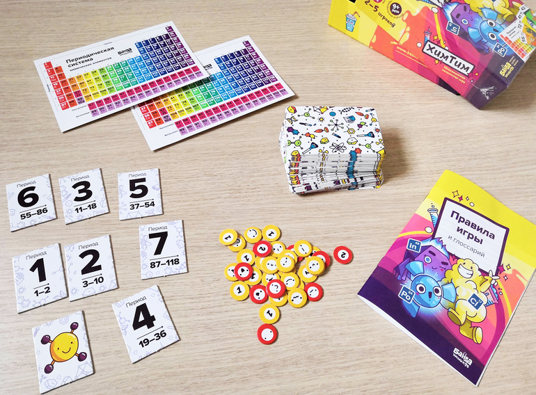Состав игры: 94 карты химических элементов, 7 жетонов периодов, жетон первого игрока, 35 жетонов-электронов, 2 таблицы Менделеева, правила игры.