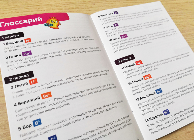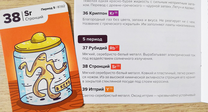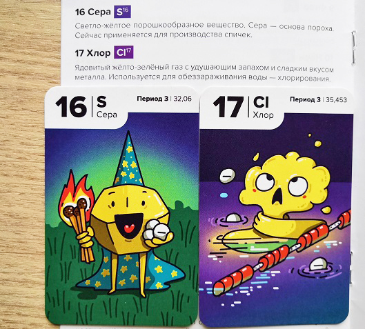 Не знаю запомнит ли ребенок, какой элемент в каком периоде, играя в первый вариант игры (во втором точно нет). Если играть часто и проговаривать название элементов, то, наверное, да. Но нужно отдавать себе отчет в том, что в игре больше внимания уделяешь цифрам, нежели названию и определению элементов. Скорее всего, вы скажете "В этот ряд я выкладываю 72 и 73", а не "В период шесть я выкладываю Гафний и Тантал". Но можно и ввести правило такого проговаривания. Мы цели выучить химические элементы не ставили, поэтому рассматривали те карточки, что больше понравились и читали в Глоссарии о них.