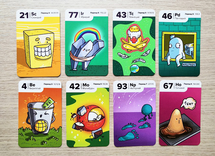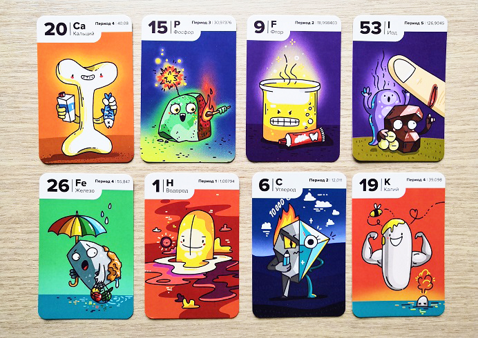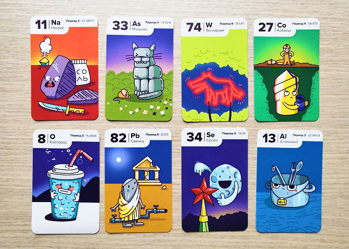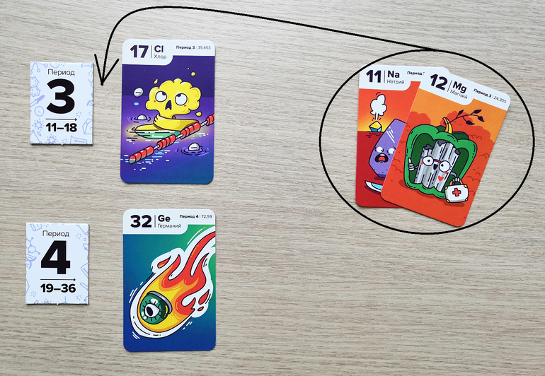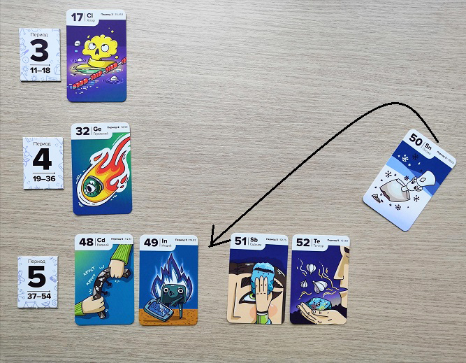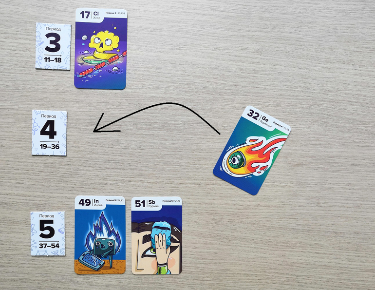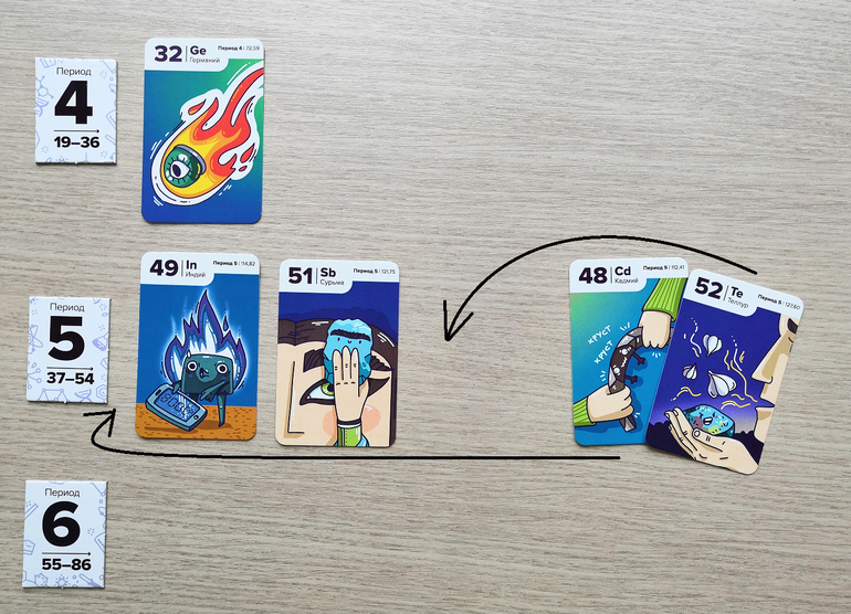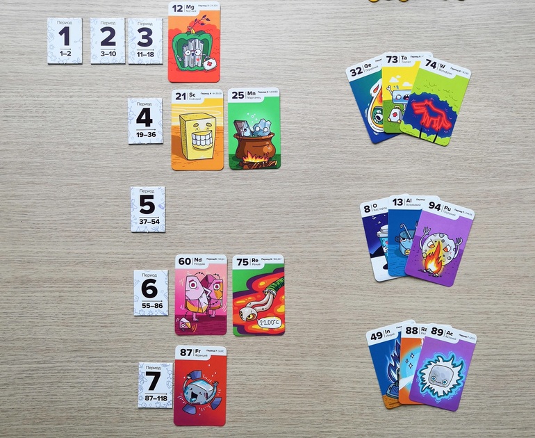 Игрокам раздается по 8 карт и 5 жетонов-электронов. Жетоны периодов выкладываются в вертикальный ряд. Места для игры понадобится много.