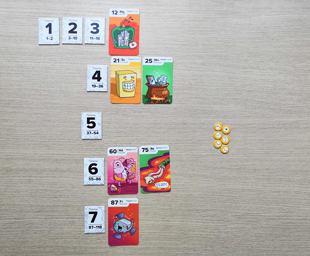 Игроки получают по 3 карты и 9 жетонов-электронов. Жетоны периодов выкладываются, как на фото (1, 2 и 3 период - считаются за один период).