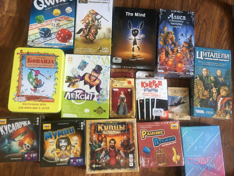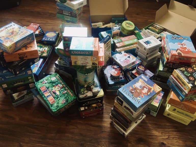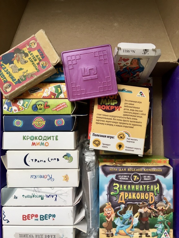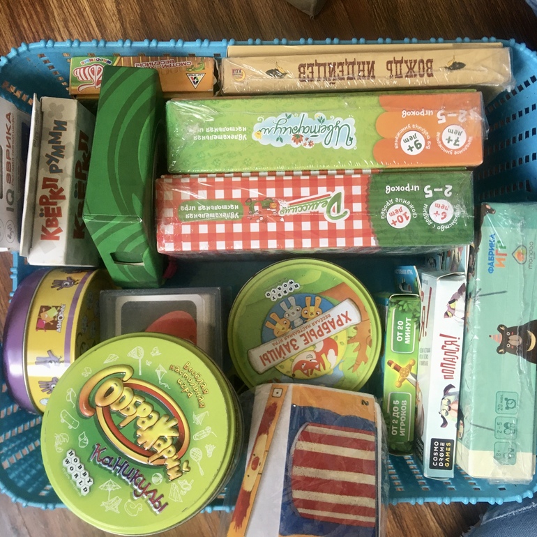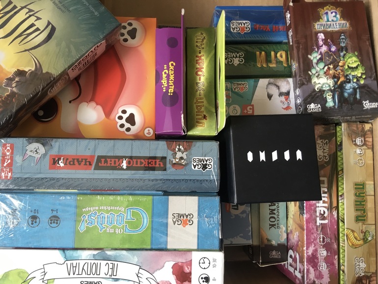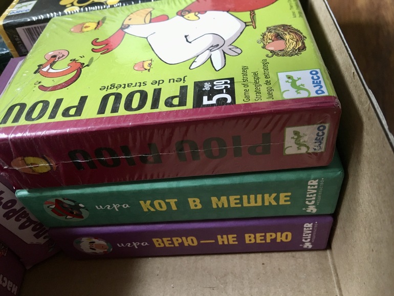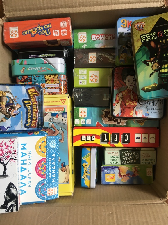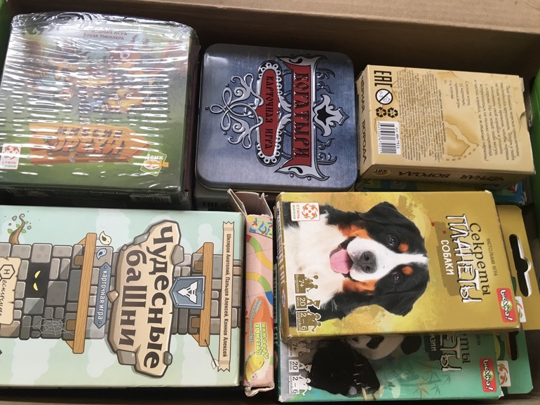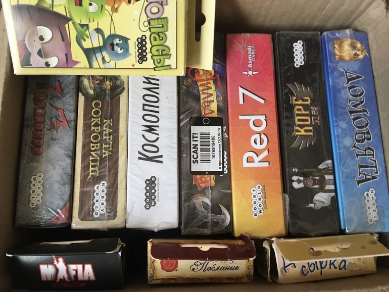 На фотографии также не попали Продано, кто я? Что я?, Вороны, Одина, солнечная долина , Веселая генетика, Путь лепестка , Сумерки Венеции . Все эти игры карточные, но коробки у них не особо компактные, поэтому они хранятся вместе с другими большими играми.