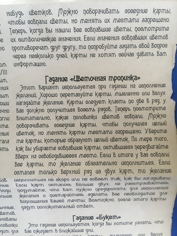 Правилами предусмотрены 4 варианта гадания. Очень нравится вариант предсказаний на исполнение желаний Цветочная тропинка.