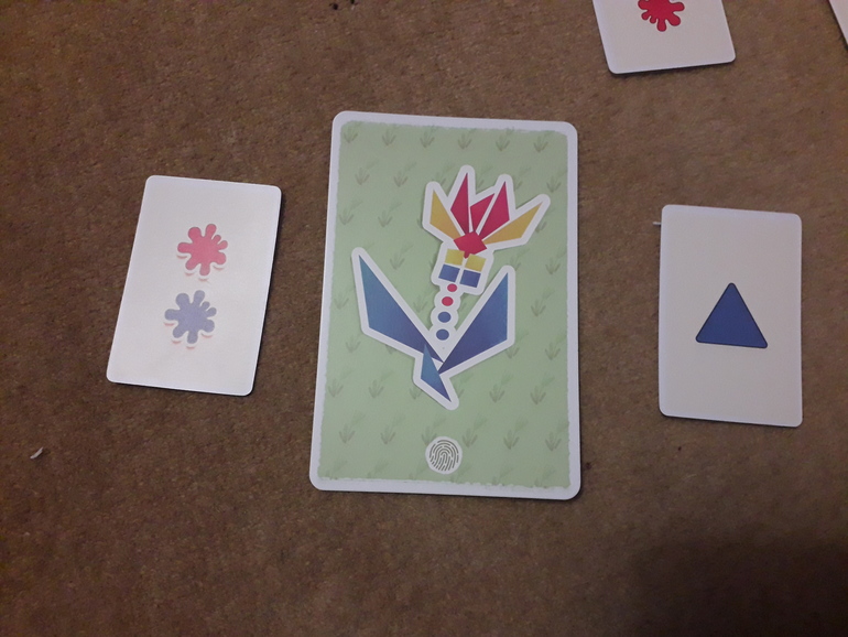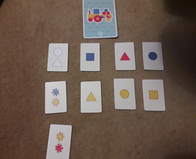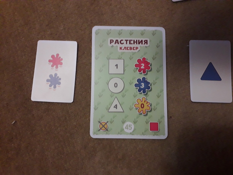 Я за свои два цвета получаю 5 очков (2+3), а сын-7 (4 за треугольник и 3 за синий цвет). Он победил. Он забирает себе рисунок (этот клевер), его карта варианта (синий треугольник) возвращается в игру, а моя карта варианта отправляется в коробку и больше в игре не участвует.