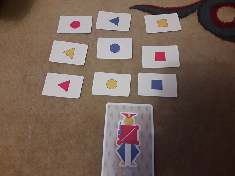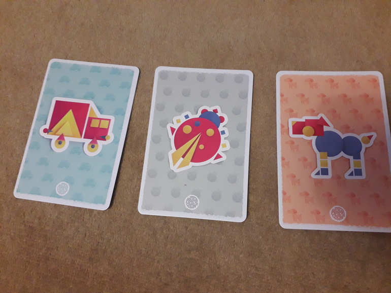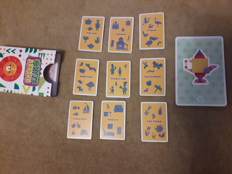 В игре два типа карт. Одни большие (с ладонь)- это сами картинки, составленные из геометрических фигур. Другие-маленькие карточки вариантов.