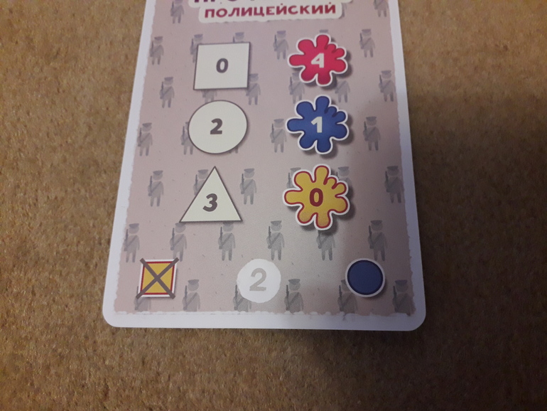 Ага, на карточке с полицейским вообще нет жёлтых квадратов. Если играли в вариант "единственная фигура в рисунке", то правильным вариантом будет карточка с синим кругом.