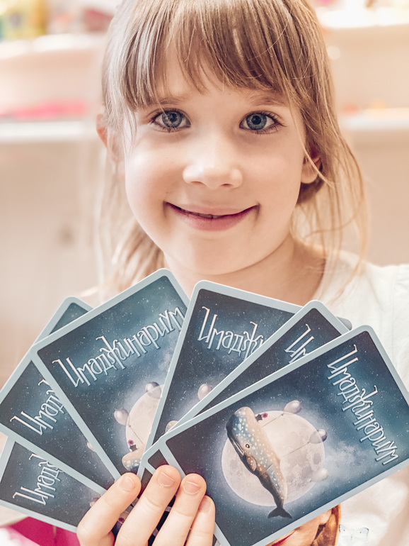 Игра всем понравилась, я бы ее снова разложила, но обещала детям Имаджинариум. В него мы играли уже всем составом в пять человек. В прошлый раз безусловным лидером оказалась младшая дочь, она зарабатывала по три очка в каждый ход. В этот раз она тоже постоянно была впереди, но уже не с таким большим отрывом.