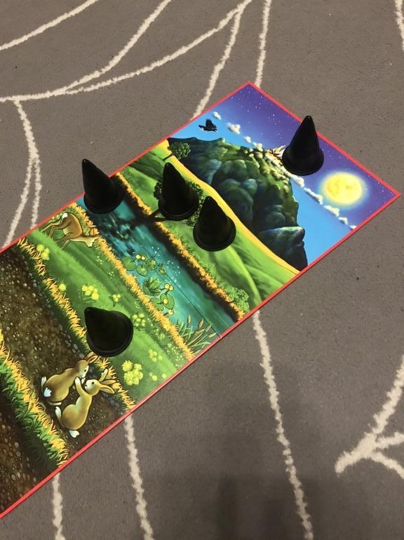 Если попал на клетку с дождиком - прячешься под зонтик (переворачиваешь фигурку вниз лягушкой), попал на солнышко - можно убрать зонтик и иногда фигурки меняются местами (символ обмена на поле). В итоге можно запутаться где чья лягушка и привести чужую к финишу)