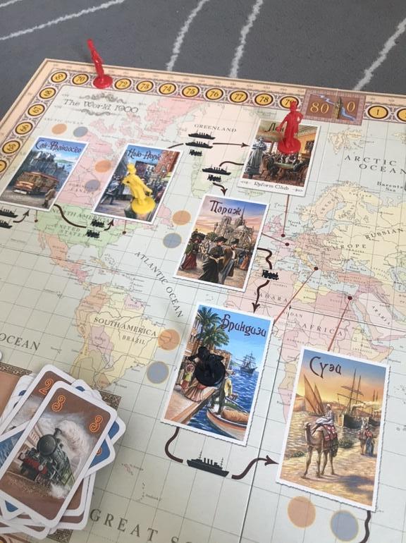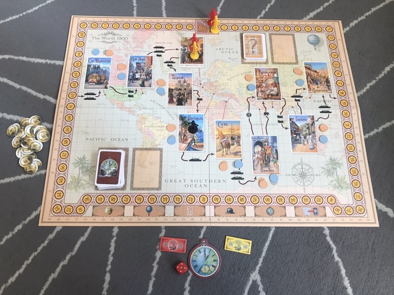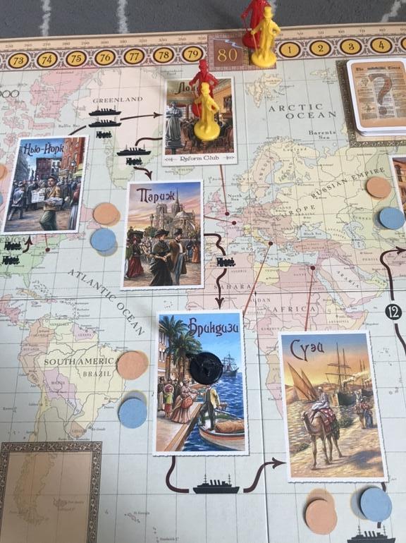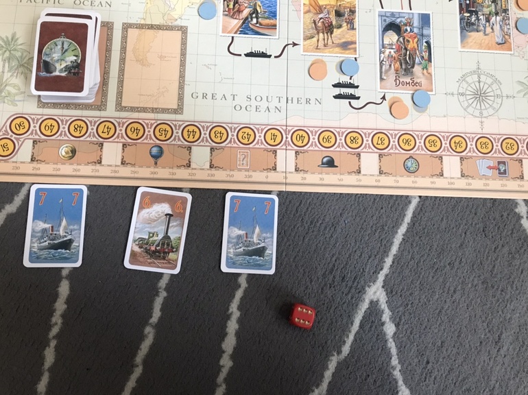 При обычном путешествии мы должны были переставить ее фигурку из Лондона в Париж, а на шкале отсчёта дней отсчитать 5+4=9 дней путешествия. Надо заметить, что в отличии от стандартных игр, здесь надо стараться двигаться по шкале как можно медленнее, потому что выигрывает тот, кто затратит наименьшее количество дней на Путешествие, то есть мы всегда пытаемся сократить время в пути. Для этого можно играть карты с наименьшим числовым значением, а можно (как дочка) путешествовать на воздушном шаре. Как это происходит, игрок сыгравший необходимые карты путешествий кидает кубик, и, вместо того чтобы складывать значение карт, как при обычном путешествии, он тратит столько дней, сколько выпало на кубике. Оно будет явно меньше 9, заплатив одну монету, кубик можно перебросить.
