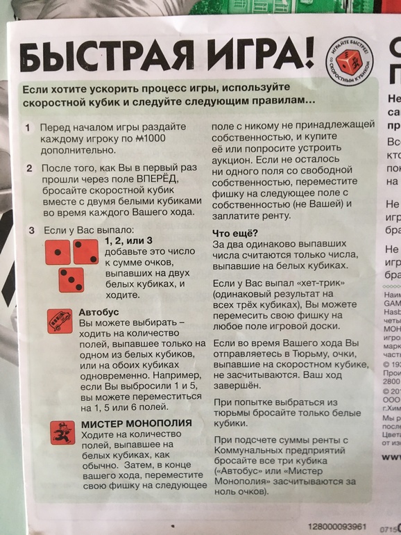 Не уверена, что нюанс с человечком на кубике , мы поняли правильно. Заканчивая ход, мы выполняли все действия, которые требовало местоположение, в том числе, платили ренту, а потом переходили на ближайшую , не свою, недвижимость и снова платили ренту. В таких условиях разорение пришло довольно быстро. Я выбыла из игры через 40 минут, сын ещё через 20. Выиграла дочка, став абсолютным монополистом.