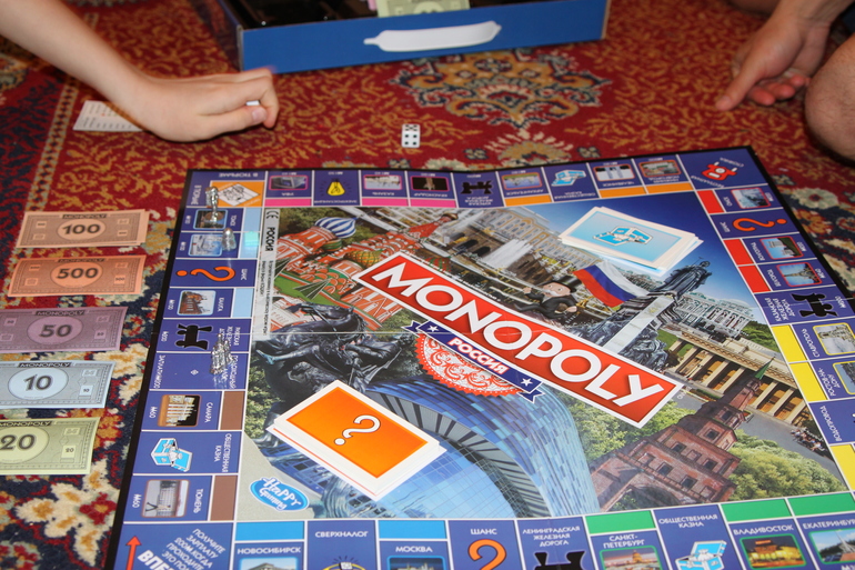 Пограли в игру всех времен и народов))) В этом году дочери подарили на др "Монополия. Россия". В классическую Монополию мы играем давно. И этот вариант нам очень понравился. Но когда покупаешь жд дороги, еще ничего, а вот фраза "Куплю я, пожалуй, Санкт - Петербург" звучит интересно, муж иногда говорит, а не побыть ли мне собчаком))) В этот раз абсолютным монополистом была дочка, я середнячок, а вот наш папа оказался весь в долгах с заложенными городами.