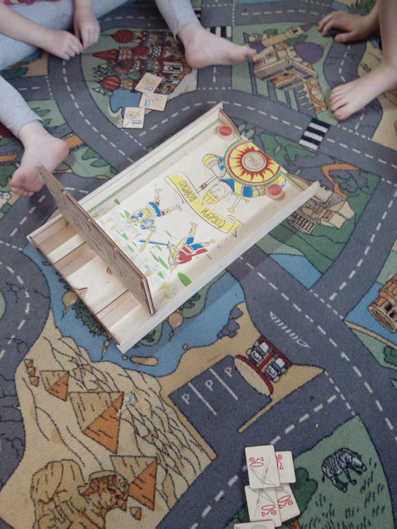 Дети сначала вышибали плашки, потом разложили орешки и пуляли уже по ним, попутно их сгрызая.