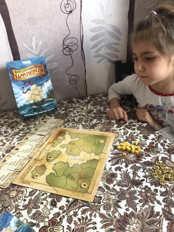 Обида была глубокой, но быстротечной 😆 минуты через две мы разложили восьмиминутную империю. Дочери пока сложно концентрироваться на двух целях одновременно, поэтому она просто собирает товары попутно выполняя действия на картах, конкуренцию она пока мне тут составить не может. Но игра безусловно очень интересная!! Что же они там в Легендах добавили, надо снимать пленку!!