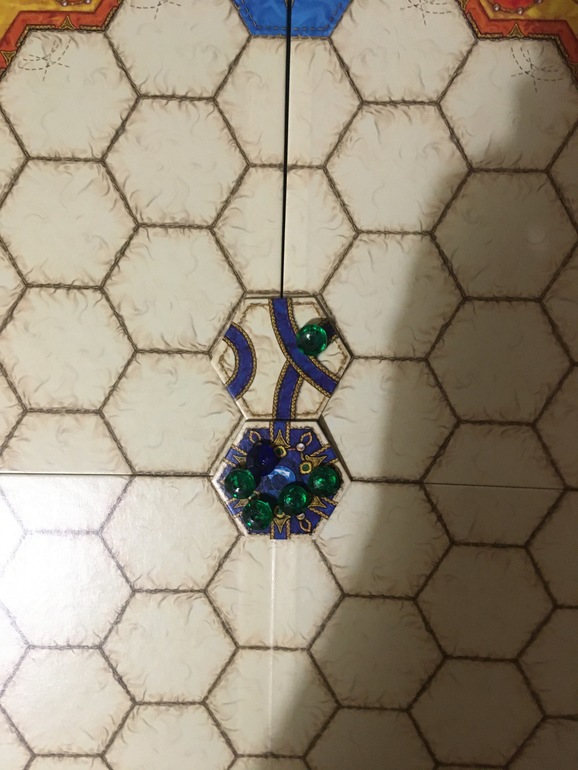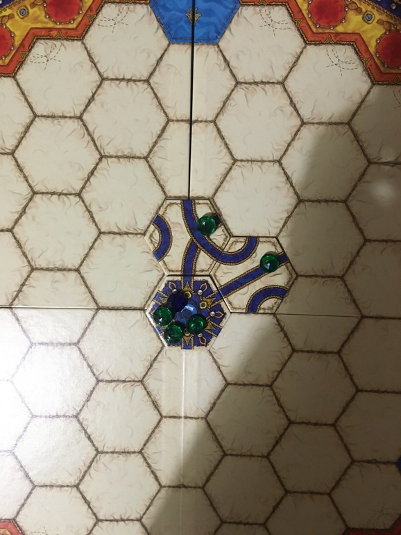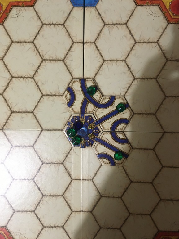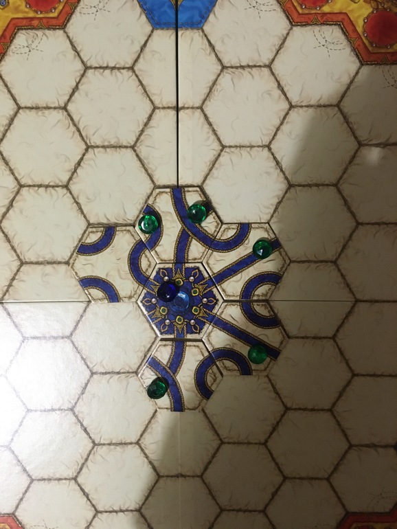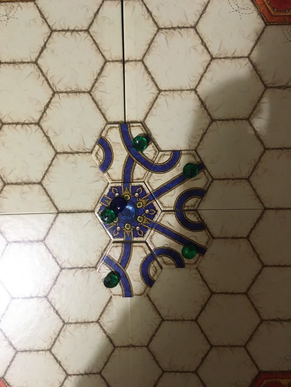 И лишь теперь, прикладывая шестой тайл к центру, мы наконец-то можем вывести синий камень по его личной дорожке, а не в след за зелёным.