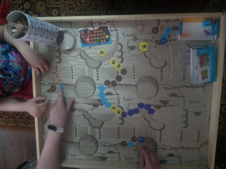 Второй день приучаем дочу. Пока не особо втыкается, но какие-то шестеренки крутятся все же. Спор идет за названия звездочек. Они почему-то считают, что это снежинки (мама) и цветочки (доча). И также Василиса хочет стать обладательницей плиткой 1-го игрока, потому что мама постоянно ее берет.