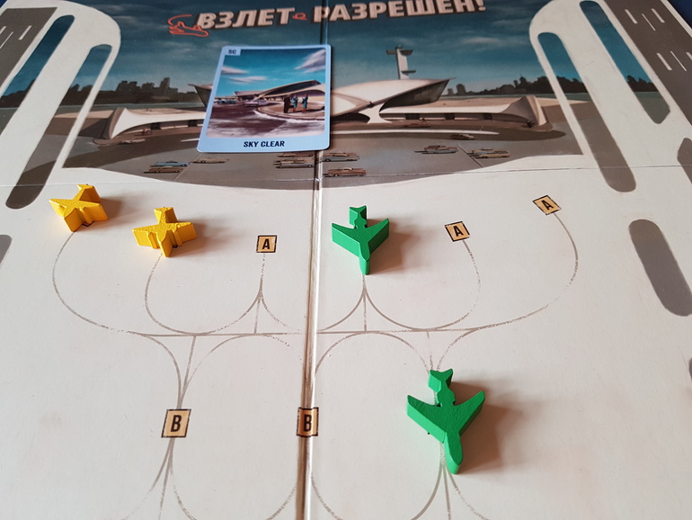 "Взлёт разрешён" закончился моей победой. Сын управлял жёлтыми мелкими самолётами, я- зелёными средними. Играли без рекомендованной правилами блокировки некоторых точек на карте при игре вдвоём. И без этого партии получаются достаточно напряженными. Имея в распоряжении 9 карт на руке, можно ощутимо влиять на передвижения самолётов соперника, просчитывая ситуацию на несколько шагов вперёд.