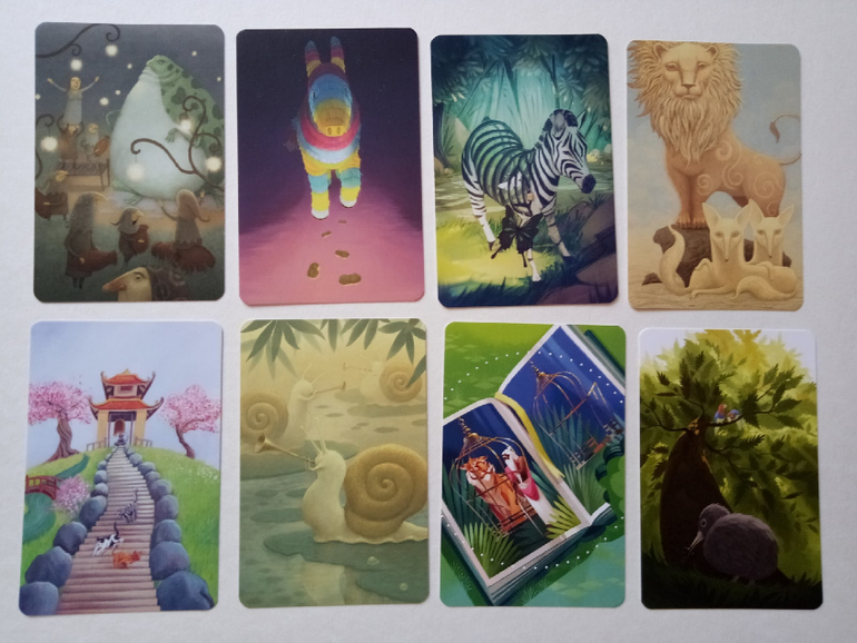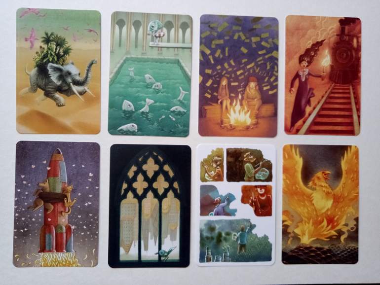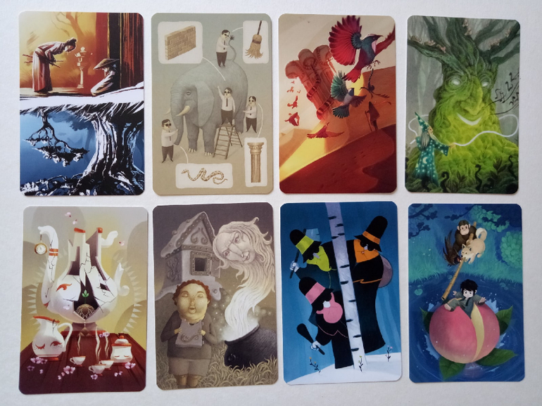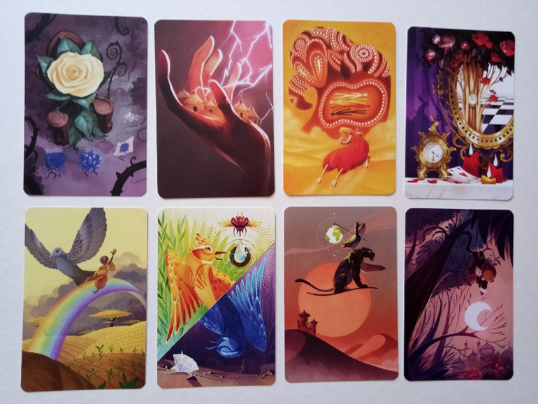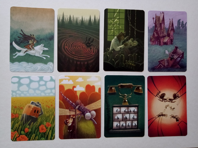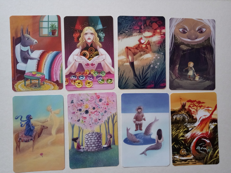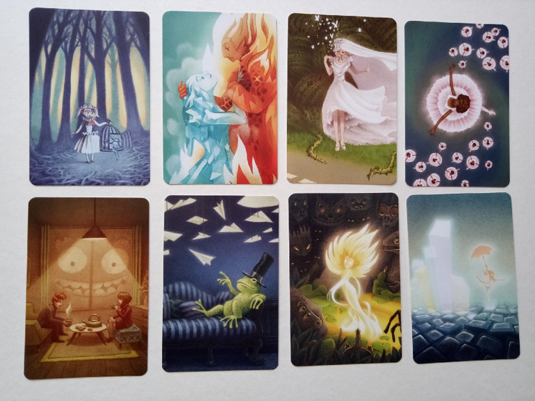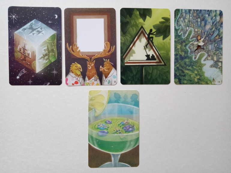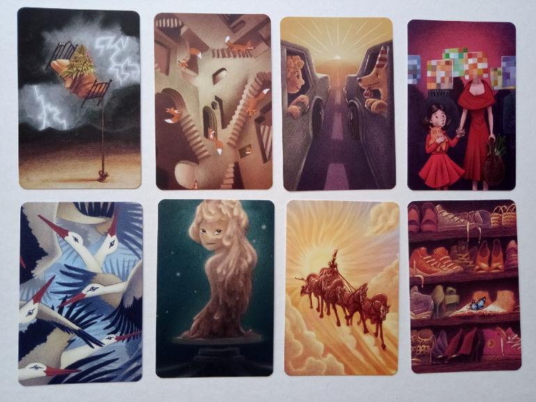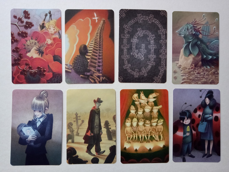 При желании можно разбирать на группы (по художникам), некоторые прямо явно прослеживаются. Я пока этом не занималась, только отложила (для наглядности) картинок на одну фотографию. Это художник (или художница), которая иллюстрировала Диксит 4. Я его тоже хотела купить, но пока не сложилось... Может потом, как-нибудь)
