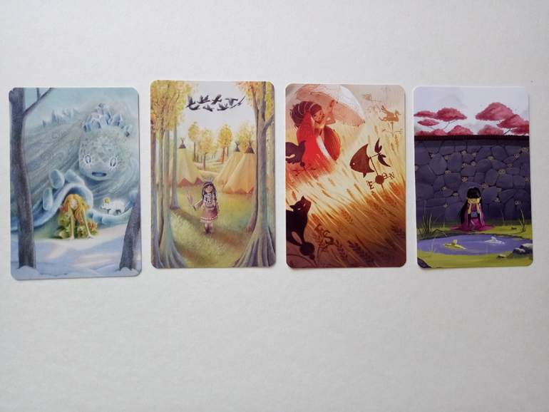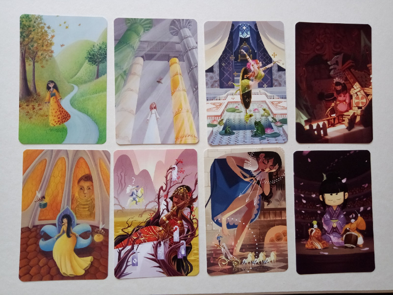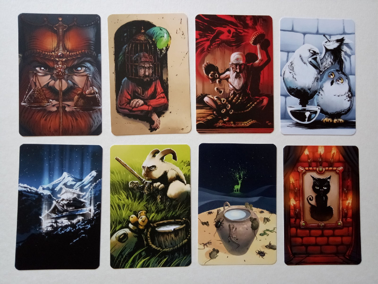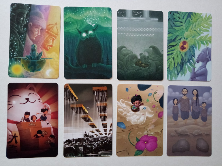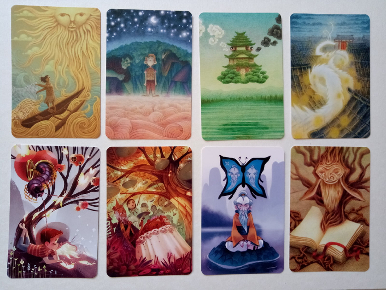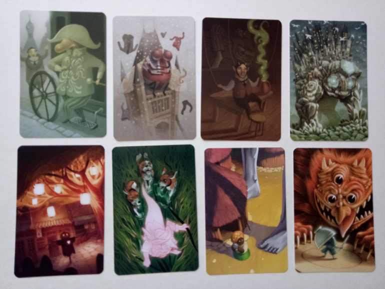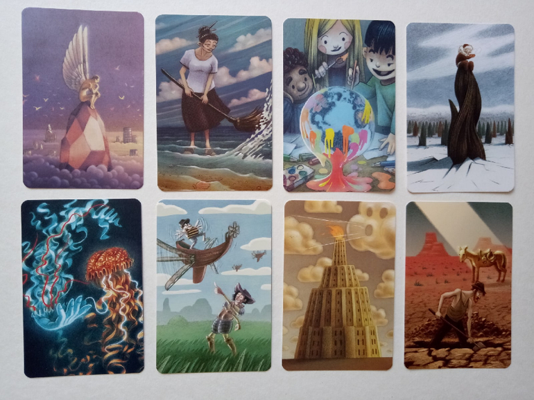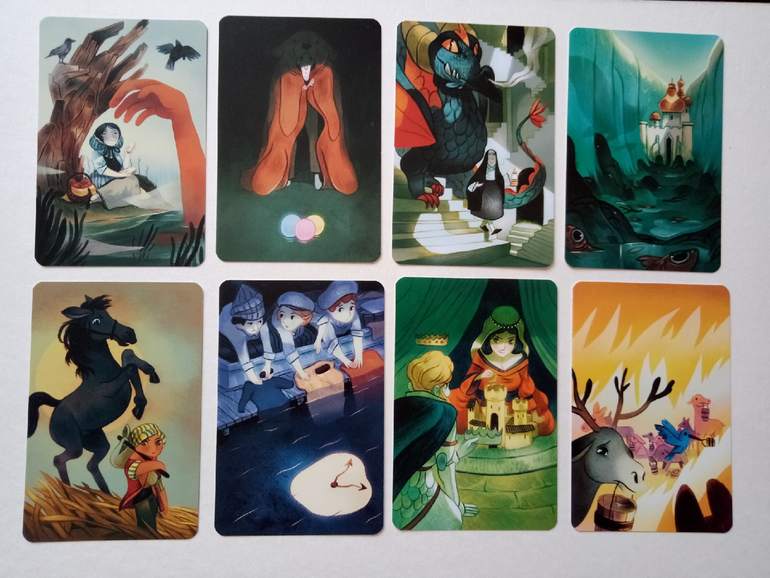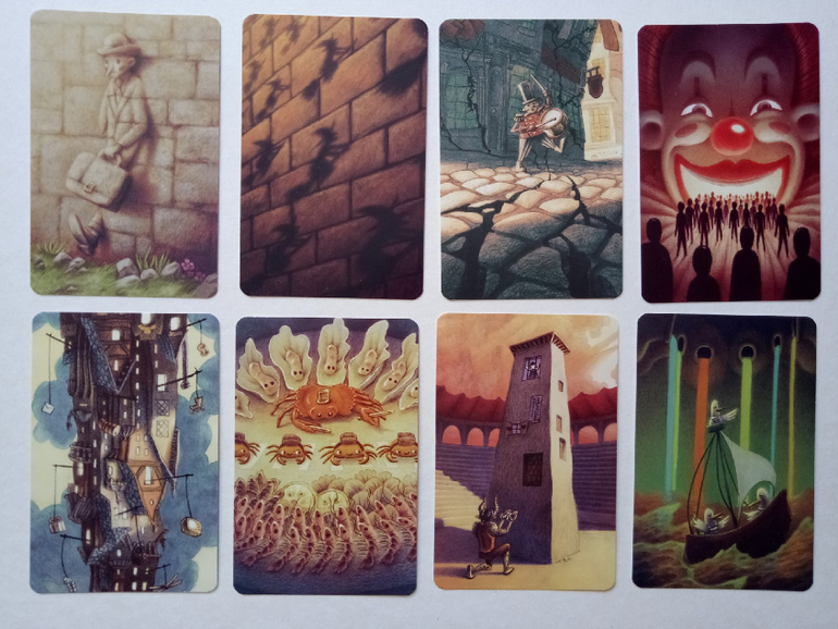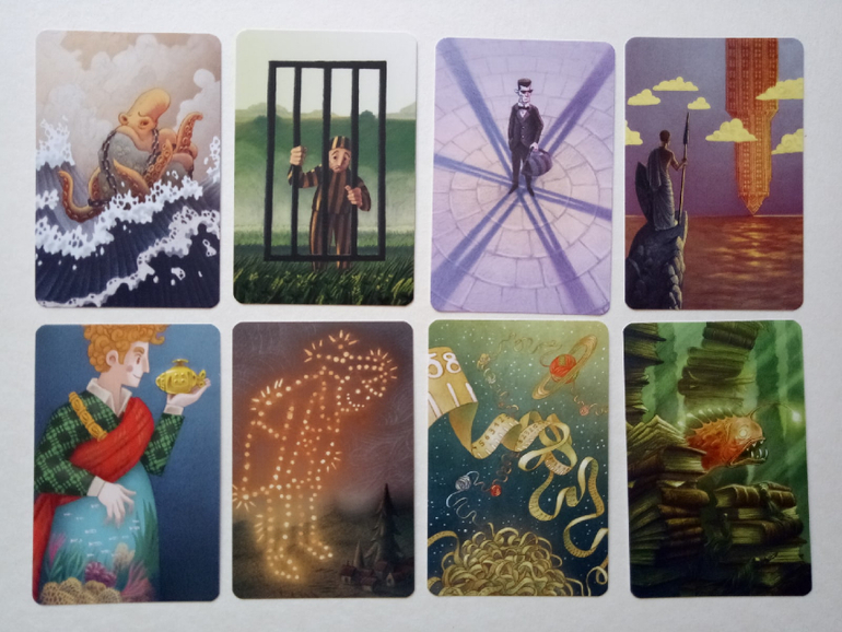 При желании можно разбирать на группы (по художникам), некоторые прямо явно прослеживаются. Я пока этом не занималась, только отложила (для наглядности) картинок на одну фотографию. Это художник (или художница), которая иллюстрировала Диксит 4. Я его тоже хотела купить, но пока не сложилось... Может потом, как-нибудь)