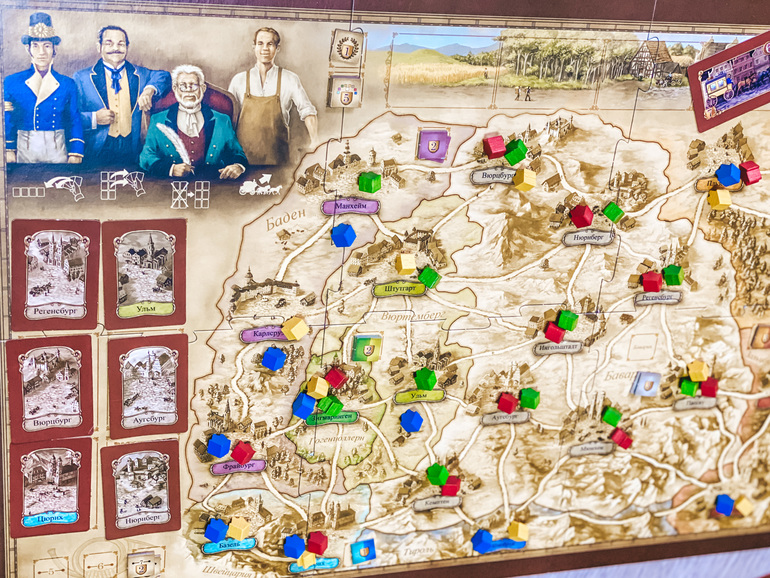 Итак, второго мая мы играли второй раз вместе с мужем. Объяснили ему правила и начали игру. Муж нацелился на то, чтобы построить станции в городах разных цветов и получить за это 6 очков. Старшая дочь снова стала строить города во всей серой области. Младшая просто что-то строила. А я пыталась собрать области одного цвета и заработать на этом. Плюс постоянно использовала каретника и брала следующие по количеству очков кареты.