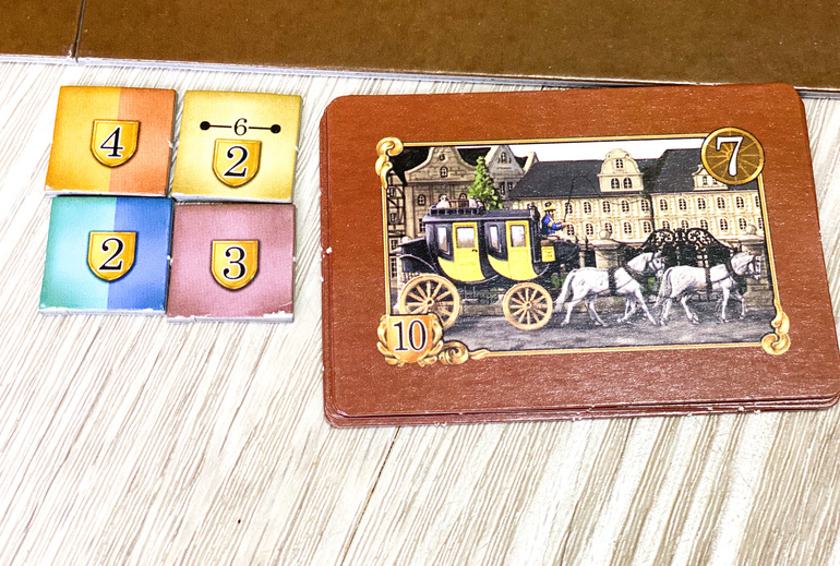 Старшая просила дать ей ещё два круга, чтобы закончить и тоже забрать последнюю карету, она уже разработала для этого план, но мы все устали, игра опять затянулась, и не дали ей этого сделать. Хотя у неё был шанс снова победить, если бы она чуть лучше рассчитывала ходы. Итог такой - 21 очко у меня, 19 у старшей дочки, и по 16 очков у мужа и у младшей.