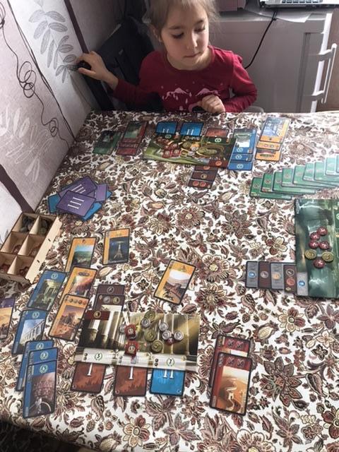 Из неожиданного 2 раза играли в 7 чудес, дочке настолько понравилась эта игра, что она просто умоляла сегодня повторить. Мы с мужем не против, вдвоём в неё не поиграешь, поэтому коробка долго пылилась на полке.