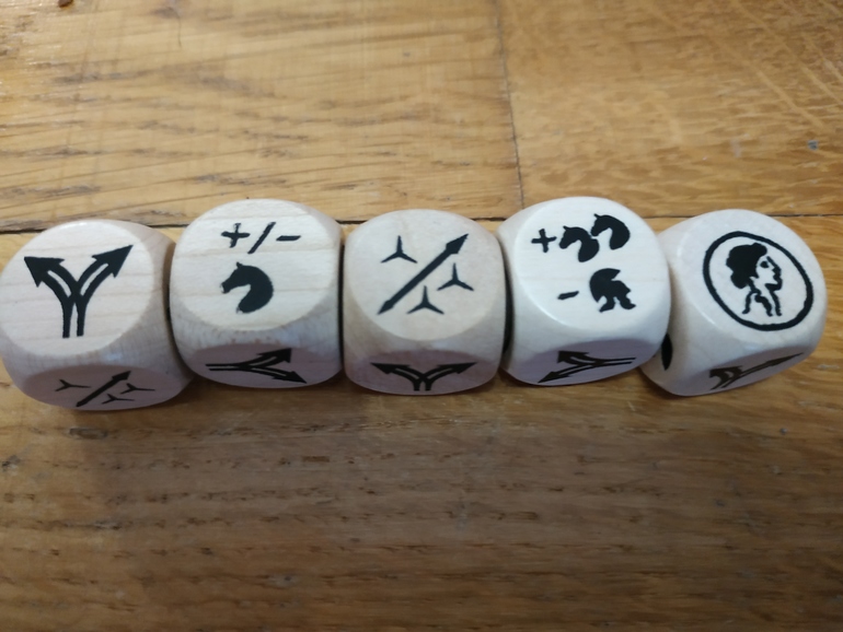 Игра оказалась незатейливой. Кратко. Имеем поле для скачек, колесницы, пять игровых кубиков, набор серых невзрачных фишек , скрепки ( чтобы отмечать на планшете урон, скорость, фортуну) и собственно планшеты. Всё!!!! Поле невзрачненькое, колесницы очень маленькие, а планшеты из очень тонкого картона ( буду их ламинировать). Ну такое:))). В начале игры устанавливаем скрепки-маркеры на планшете на стартовые позиции. Всего позиций три, а именно: скорость, урон, фортуна. Кидаем кубики (колличество кубиков зависит от вашей скорости) и выполняем действие указанное на кубиках. Если нам не нравится то, что выпало на кубиках, мы можем первый раз перекинуть любое колличество кубиков. Второй раз за это прийдется платить очками фортуны. Вот собственно так выглядит планшет в первый ход.