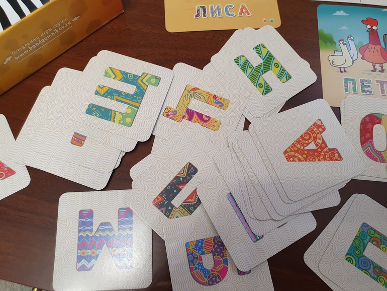 Коробка от этой игры какая то несуразная. В наборе есть буквы, предназначенные для игры, внизу которых нарисованы цветные лапки, и есть просто карточки с буквами, для добавления в вариант с игрой мемо. Чтобы они не путались между собой, разделяем их на две стопки, но тогда они ровно не ложатся в коробку. Прям беда эстета))).
