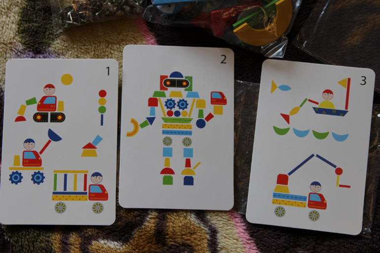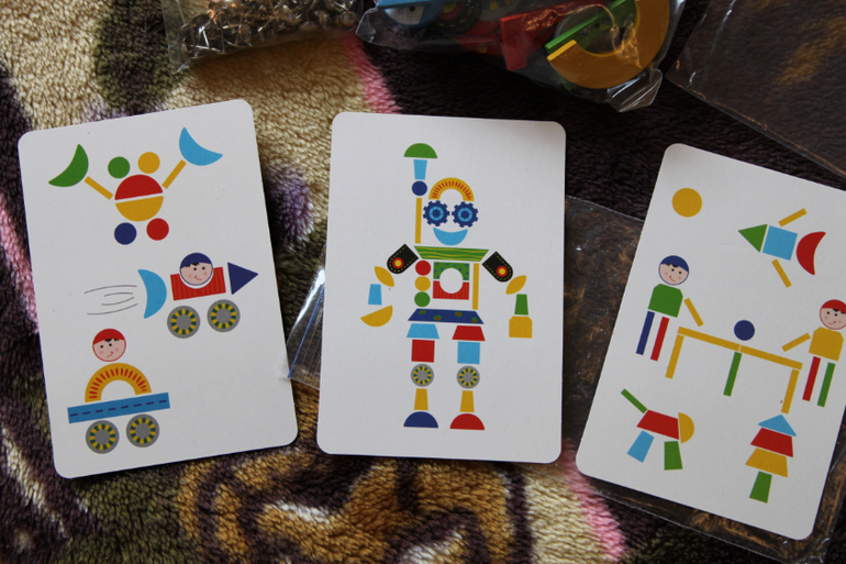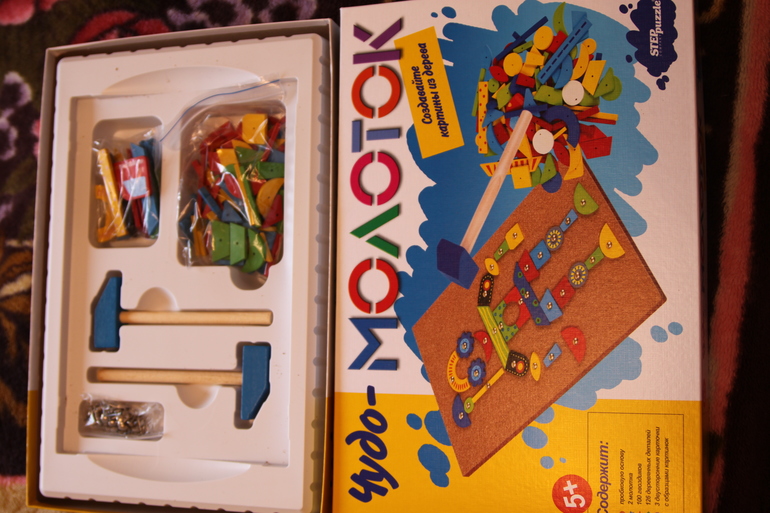 На фото видно: два молотка, детальки в двух пакетах, пакетик с гвоздиками, карточки. Карточки всего три((( Считаю, что можно было сделать их штук сто и разделить по уровню. Столько вариантов поделок!