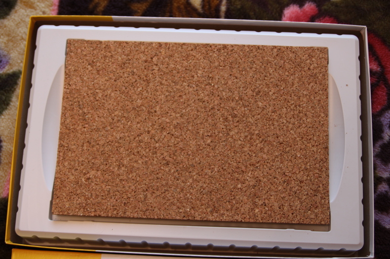 Маленькая пробковая доска! Я рассчитывала, что будет размером с коробку, но размер доски всего А4. Доска мягкая, гвоздики можно воткнуть и так, но для сына самый кайф в стучании молотком.