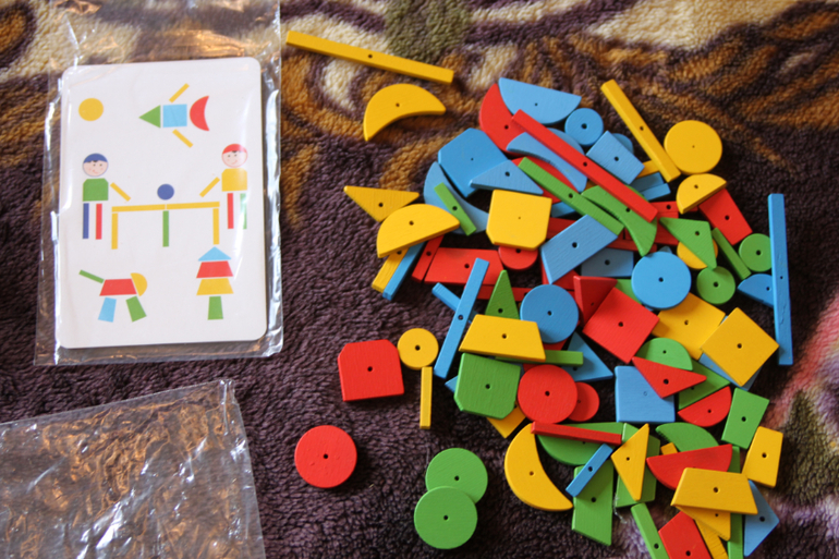Деталей два вида: с рисунком и без. Яркие, основных цветов. Деревянные, хорошего качества, без зазубрин. Поделок можно сделать большое количество от самых простых и очень сложных. Дочь делала домики, цветы, девочку с сачком. сын машинки, дорогу, зимовье)