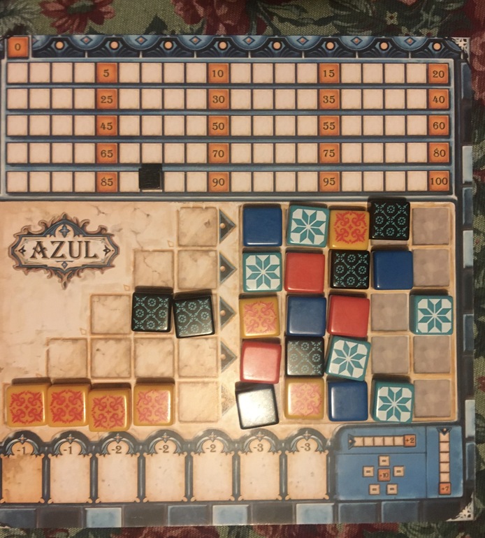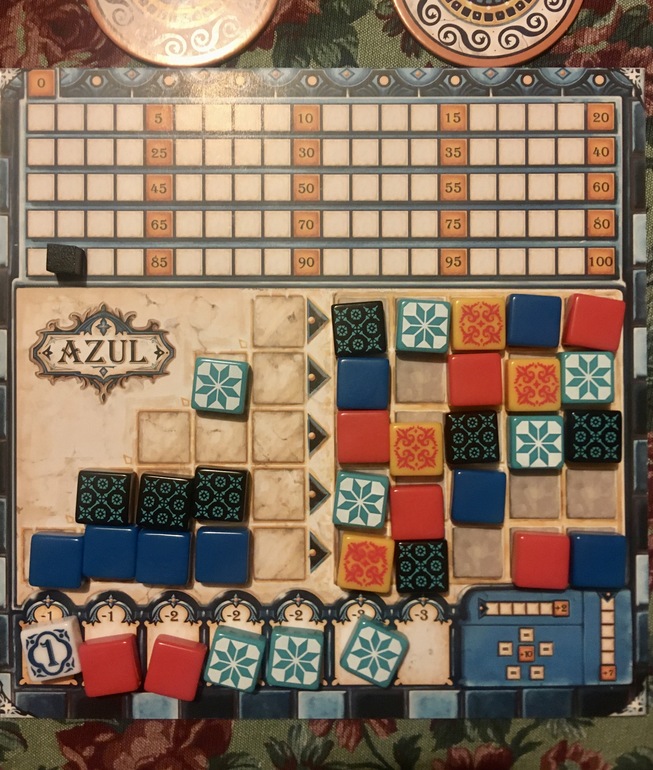 Мы ещё с дочкой сыграли перед сном в азул две партии. Оба раза мы остались с дочкой не слишком довольны результатом. В первой партии у меня 98 баллов, а у дочки 95.