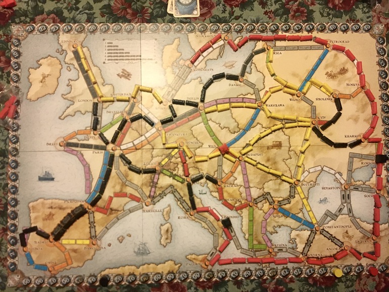 Мы уже вечером сыграли с мужем и дочкой две партии в Билет на поезд. Дочка в первой партии разбила наши надежды на победу в пух и прах. Она брала несколько раз дополнительные маршруты и каждый раз оказывалось, что такой маршрут у неё уже готов. Счёт 144 - у дочки. У меня- 121, у мужа- 105.