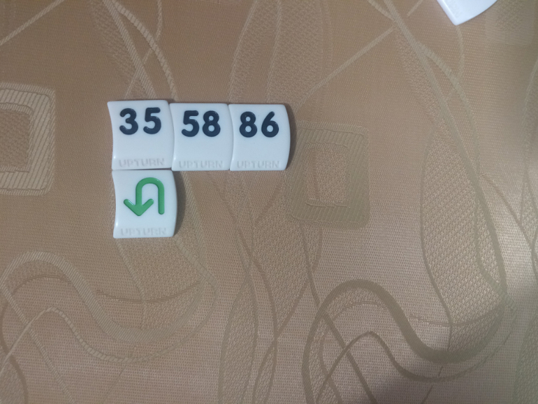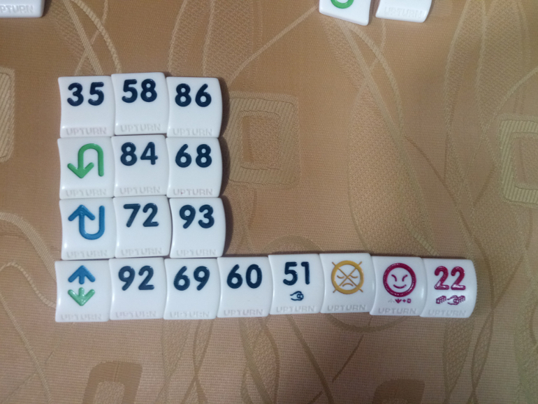 Обычные числа. Задача избавиться от всех фишек, выкладывая их в порядке возрастания или убывания. Когда остается одна фишка, надо предупредить об этом остальных иначе штраф - 3 фишки (привет, Uno!), закончить игру, равно как и начать ее, можно только фишкой с цифрой. Всем раздается по 7 фишек и одна из мешка выкладывается в центр поля. Кто будет первый, решает армреслинг;