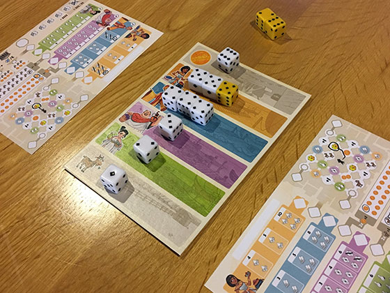 В комплекте кубики (9 белых и 3 желтых), общее поле и листы-планшеты игроков.
