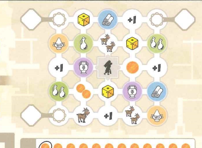 Для этого он также забирает все кубики из одной области, но их количество значения иметь не будет. Важно только выпавшее значение - именно столько шагов игрок сможет сделать на рынке (поэтому можно забирать, кубики товаров нужные соперникам). Количество шагов можно корректировать, заплатив монеты (одно из зданий имеет такую же функцию).