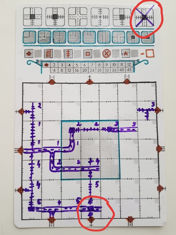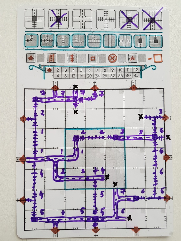 В верхней части поля есть 6 разнообразных перекрестков. Таких значений на кубиках нет, но их все-таки можно встроить в свою сеть (не более трех за партию). На фото выше отметила один.