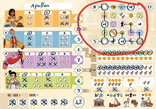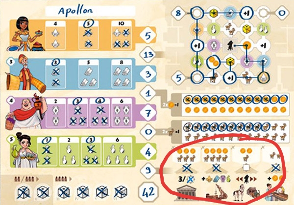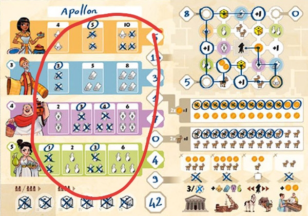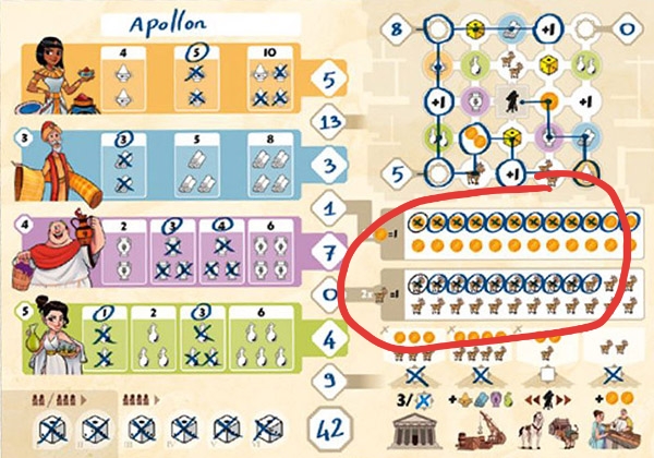 Игроки по очереди, начиная с первого, берут все кубики из одной области. Если это монеты или козы, то их количество отмечается на соответствующем треке.