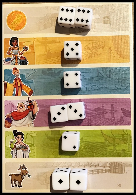 Первый игрок бросает 9 белых кубиков и распределяет их в гавани. Кубики с самым большим значением становятся золотыми монетами, с самым маленьким - козами. Остальные товарами, раскладываются снизу вверх, начиная с маленьких значений.