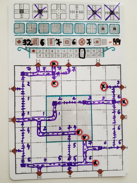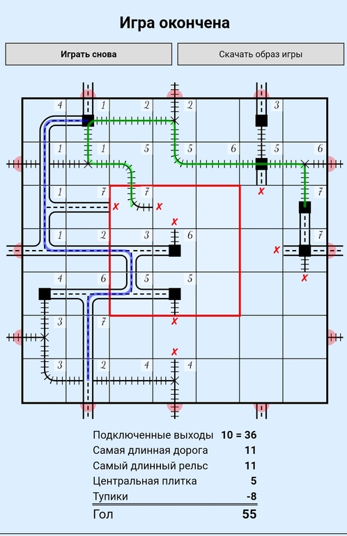 Очки приносят соединенные выходы (на фото ниже 9 принесли 32 очка), самая длинная железная дорога (в данном случае у меня 7) и шоссе (у меня 6). За то, что я провела дороги к жителям центральных районов, мне добавили еще 6 очков. Но зато оштрафовали на 7 за незавершенные участки.