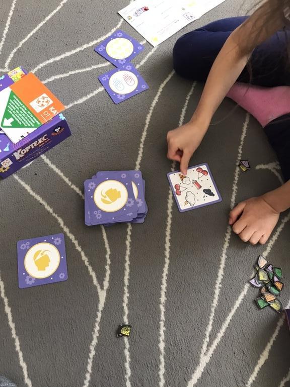 Только вчера я радовалась, что мы сыграли в неё и я могу со спокойной совестью закинуть коробочку подальше, но дочери игра понравилась, сегодня она выиграла, я почти не поддавалась). У дочери сложности с запоминанием предметов, лучше всего ей удаётся найти пару, найти лишнее или недостающую фигурку в заданиях по типу тетриса. С тактильными картами у нас обеих проблемы.