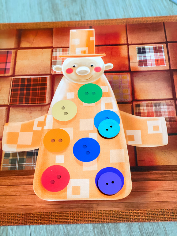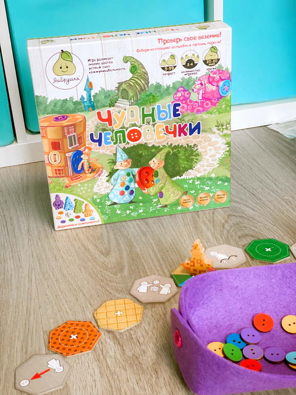 Пуговицы деревянные, яркие, одно удовольствие играть такими компонентами. Человечки большие, что радует, они тут к месту, и тоже деревянные. Нам всем эта игра понравилась. Победила снова младшая дочь, первой собрав все пуговицы.