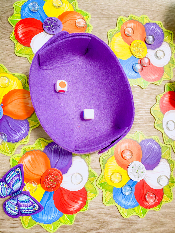 Этот момент немного затянул игру, потому что дождика стало много, и мало того, что ты не мог получить оставшуюся пыльцу, так ещё и приходилось отдавать и снова пытаться получить нужный цвет. Мы с младшей шли наравне, потом она меня обыграла на одну фишку, потом я снова ее догнала. Очень долго мы с ней были с пятью цветами, потом с четырьмя, потом снова накопили пять.