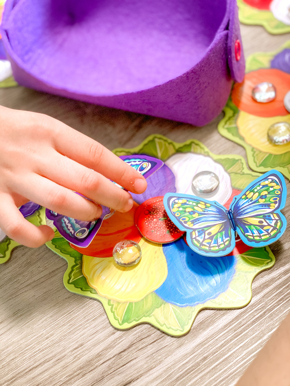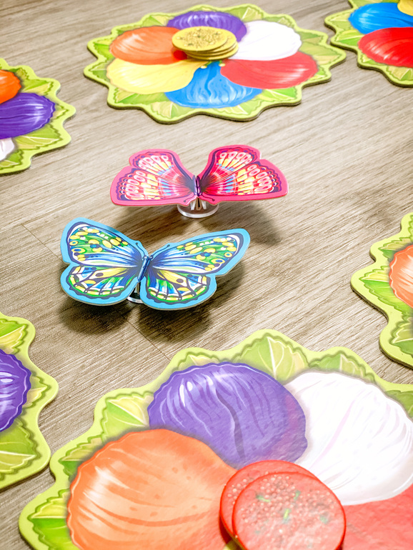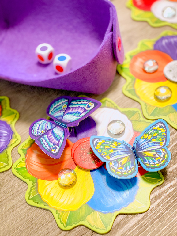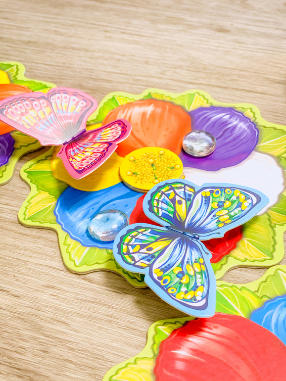 Итак, начали все бодренько, 3-4 фишки пыльцы мы с младшей дочкой получили за 3-4 хода, то есть каждый раунд нам доставался один цвет. Старшая дочь разок кинула кубики неудачно и осталась без фишки. А вот после 4 раундов дождика на лепестках стало многовато и бросок кубика часто не приносил ничего, а потом так и вовсе приходилось отдавать пыльцу, когда капелька падала на твою бабочку.