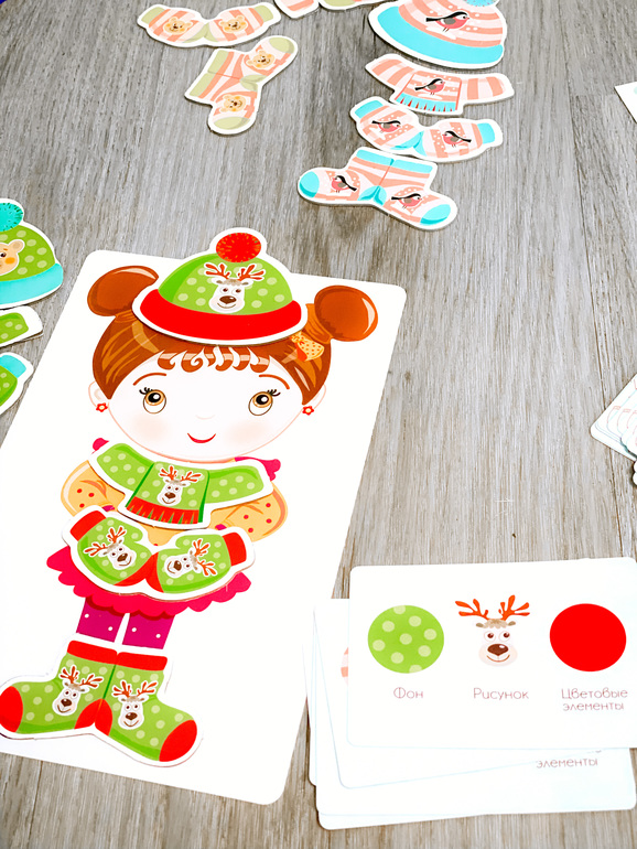 Качество снова похвалю, предметы одежды яркие, двухсторонние, картон плотный. Карточки детей лучше бы тоже были из толстого картона, конечно, но будем надеяться младшая не станет их гнуть. Размер у них очень большой, кстати, не ожидала.