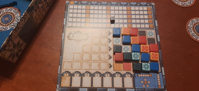 Итак, первым был Азул. Это - игра-мечта кинестетика. Как же я люблю рыться в этом мешочке! Мммм. Сын тоже говорит, что игру прямо-таки обожает, выигрываем в нее все по очереди. Какого-то перевеса явного нет. Но сын сейчас решил испробовать разные тактики, и вчера пытался выстроить 3 вертикали, а так как у меня были и другие игровые планы на вечер я не дала ему собрать 4 и 5 ряды. Сама же быстренько собрала одну вертикаль, синие цвета и закрыла горизонталь, обогнав его на 20 очков. Он свой планшет сфотать не дал, вот мой результат: