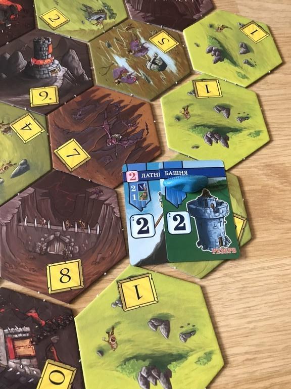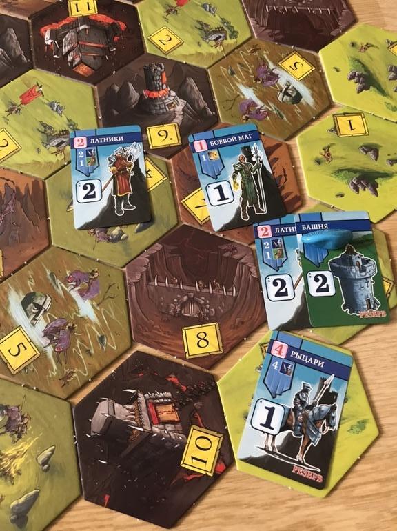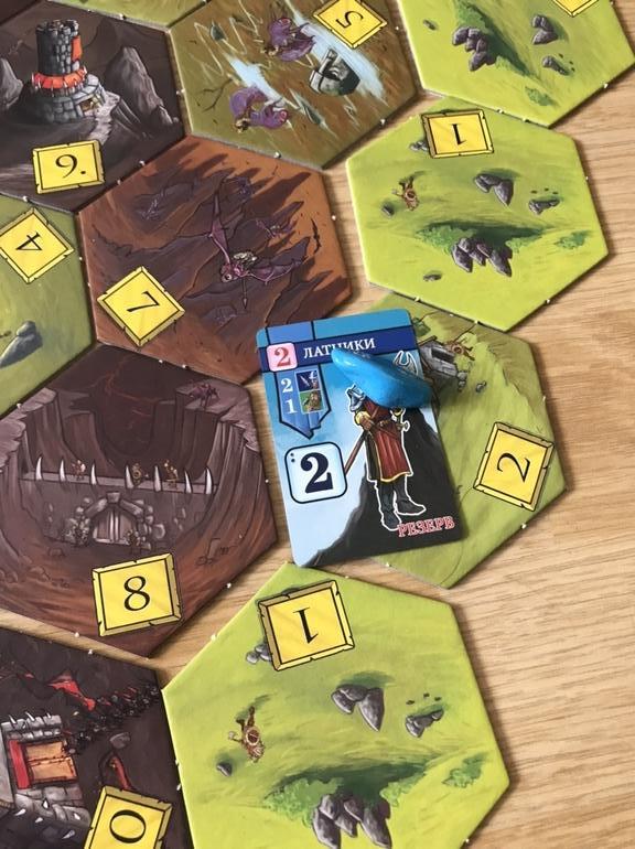 Вот мы завоевали участок с цифрой 2, использовав латников с силой атаки 2, при этом переворачиваем свои жетоны соратников, указанных на этой карте, больше мы их в данный ход использовать не можем. При этом мы получаем награду 2 монеты.