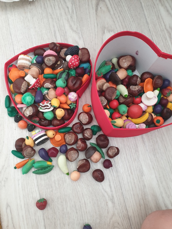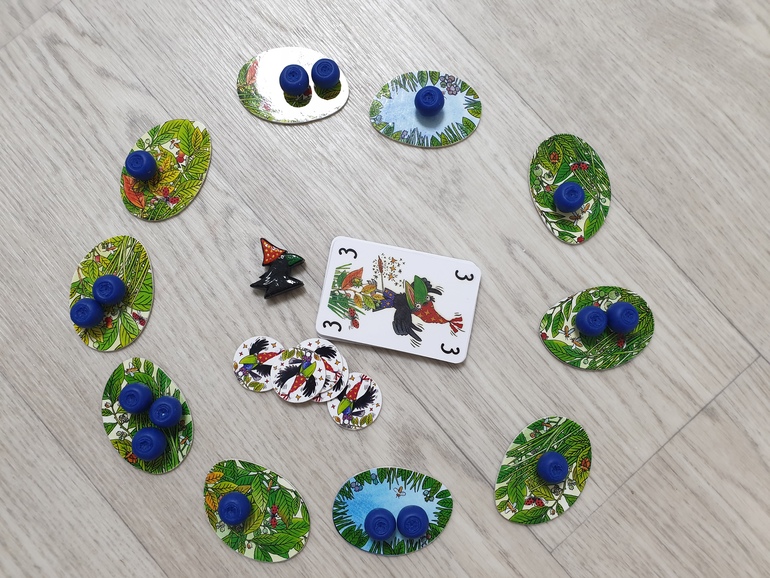 Из полимерной глины, как раз одной упаковочки хватило и ворона тоже из нее же. Это было на волне увлечения пластикой, сколько я тогда овощей/фруктов и ягод детям налепила...денег тогда лишних не было, а играть хотелось очень. Во многих не настольных играх они были задействованы, ну и одной настольной вот перепало)