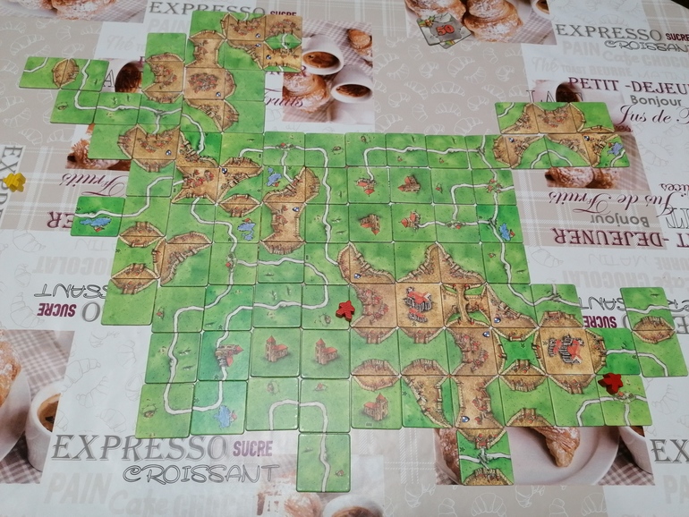 Лоскутное королевство. Решил попробовать укладывать тайлы по спирали (красиво чтоб было). В результате опять прозевал, и ему пришлось сбросить 2 тайла. И при этом совсем чуть-чуть от меня отстал 114×110.