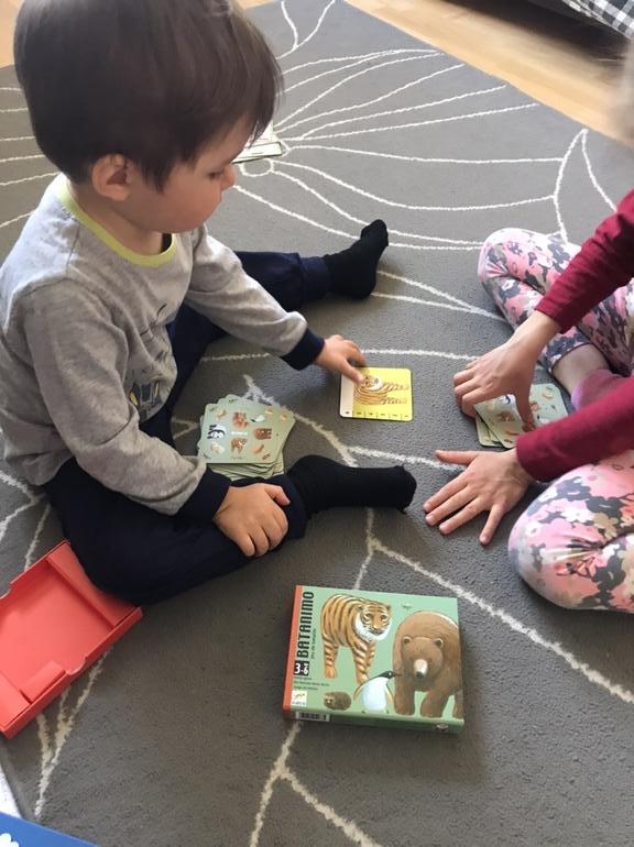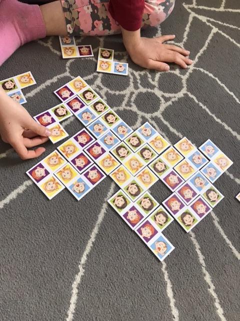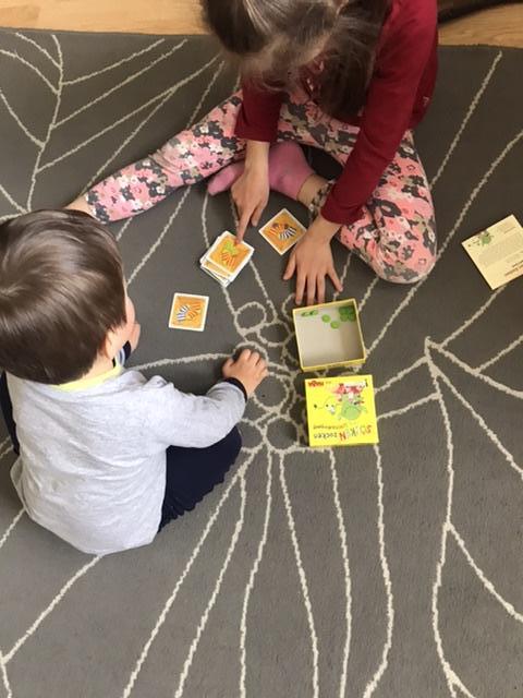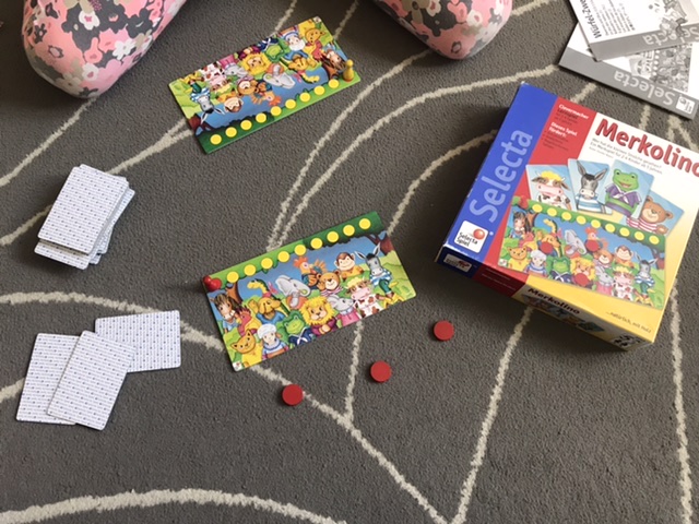 Мы не успели закончить, как проснулся сын. Он сразу уселся за пазлы, поэтому мы с дочкой успели разложить ещё пару маленьких игр. Одну из самых любимых игр с механикой мемо от Selecta.