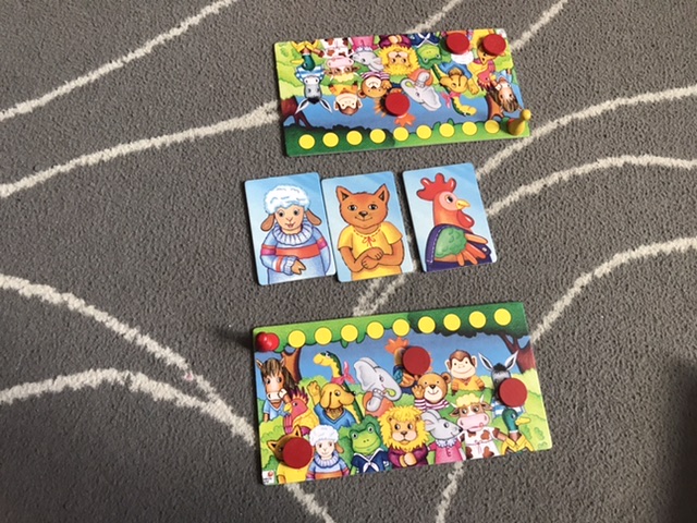 На фото я вместо овечки отметила ослика). В зависимости от количество угаданных животных, игроки передвигают свои фишки на треке вверху планшета. Кто первый дойдёт до конца, тот и победил. Отличная игра на внимание лет с 4.
